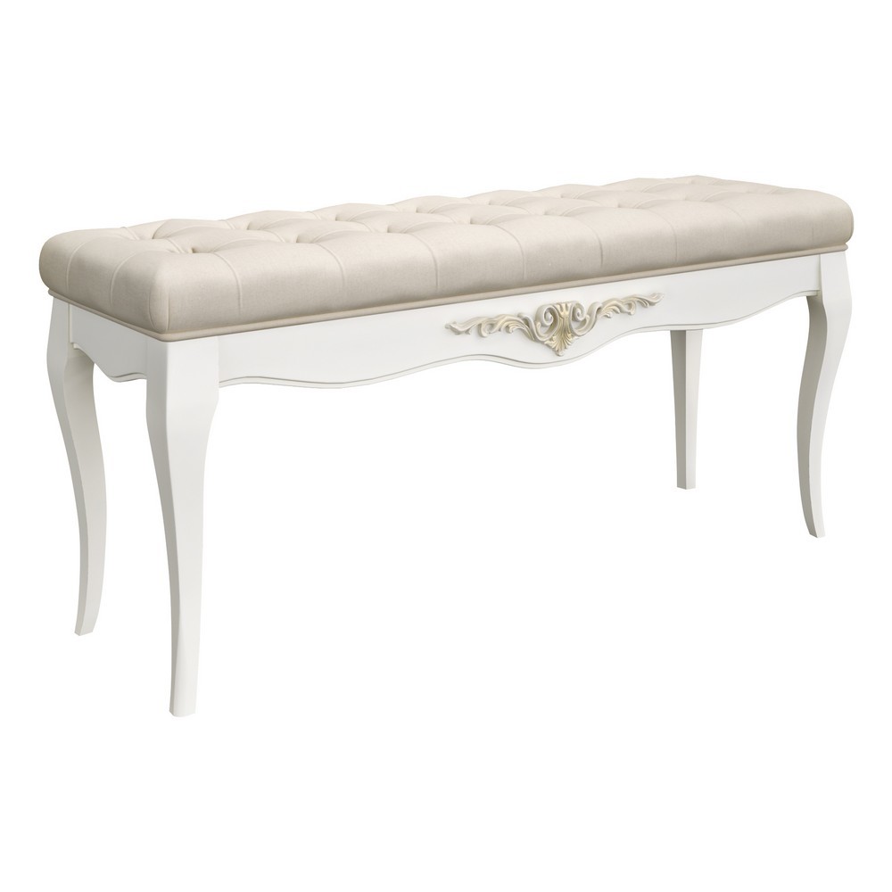 Элегантная скамья неизменный атрибут роскошных классических интерьеров. Позолоченные декоративные элементы органично сочетаются с нежнейшим оттенком слоновой кости. Ножки сделаны из натурального массива – самого прочного и экологичного материала. Мебель можно использовать для обустройства жилых помещений в стиле ампир, модерн или шебби-шик. Сборка не требуется.