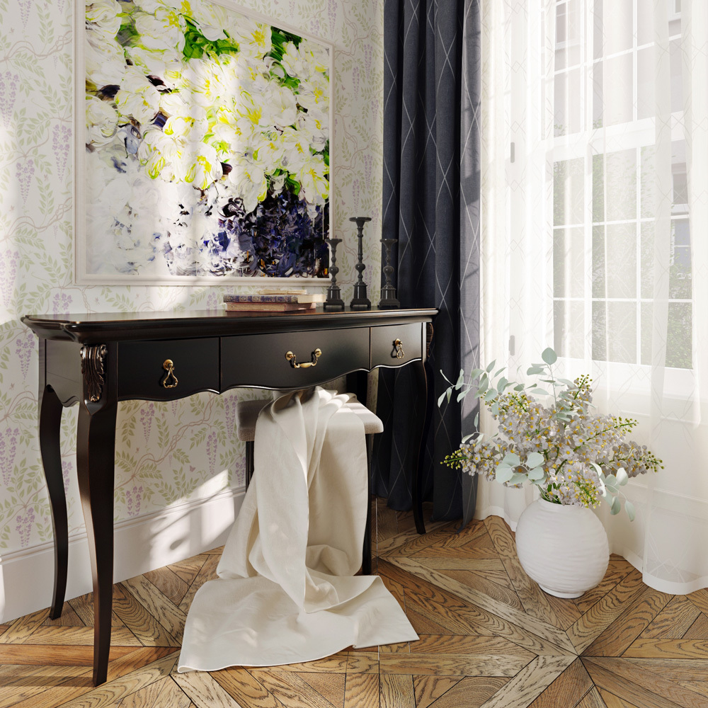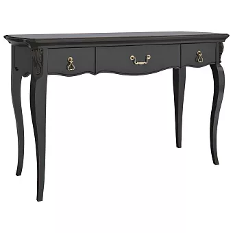 Эта консоль из массива бука обладает изысканным дизайном, в котором угадываются все ключевые элементы французского стиля Прованс. Основной цвет – глубокий матовый антрацит, который удачно комбинируется с декоративными эелементами с эффектом старения. Столик оснащен тремя выдвижными ящиками для хранения различных полезных мелочей. Требуется сборка.