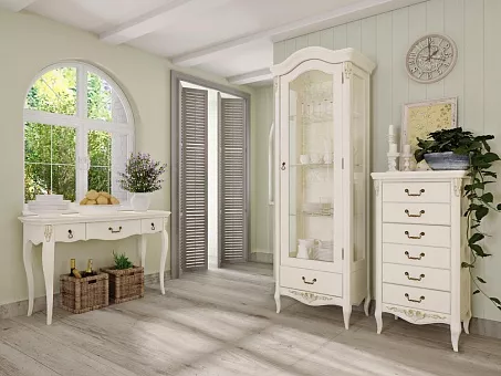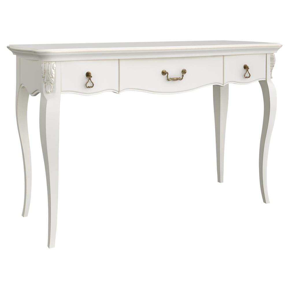 Отличительной особенностью этого стола-консоли является эффектный внешний вид и функциональность. Длинные точеные ножки поражают своей простотой и изысканностью, которая характерна для стиля «прованс». Основной цвет – «слоновая кость», дополненная золотом, подчеркивает романтический образ и придает внешнему виду нотки роскоши. Для хранения различных вещей предусмотрены три выдвигающихся ящика с фасадами оригинальной формы. Требуется сборка.