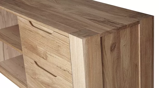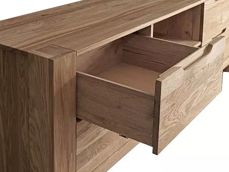 Тумба для ТВ Riva цвет Тик это элитная мебель для интерьера в стиле лофт. Обработка втиранием натуральным тиковым маслом. Которое защищает поверхность древисины от гниения и внешних воздействий но а тоже время не скрывает всю красоту рисунка дерева.Выполнен из цельно ламельного дубового щита. Фурнитура направляющие европейского производства Hettich.Направляющие снабжены доводчиком и механизмом бесшумного открытия и закрытия. Дубовый щит сочетает в себе различные цветовые оттенки дерева а так же красивые переходы и естественные затемнения и текстуры. Присутсвуют сучки и трещинки не влияющие на технические характеристики используемой мебели а так же шашель на частичных поверхностях.