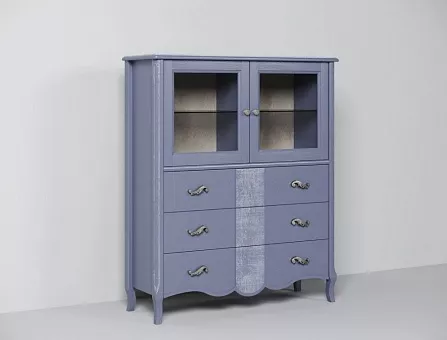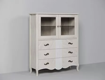 Набор выполнен с использованием шпона и массива дуба на лицевых поверхностях. Украшают набор: фигурный набор шпона, декоративные элементы с выдавленными полосками, подчёркивающими структуру древесины, волнообразные кромки нижних деталей, объёдиняющие все изделия в единую композицию. Зеркало навесное овальной формы прекрасно сочетается с таким же по конфигурации на шкафу. Внутренние поверхности деталей облицованы плёнкой с финиш-эффектом. Крышки из плиты ДСП, облицованной шпоном и бруском дуба с профильным фрезерованием по лицевым кромкам.