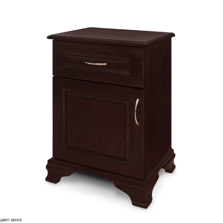 Деревянная прикроватная тумба "Бажена 1.1". Отличное дополнение к кровати одноименной модели. Особенность этой тумбочки - фигурная фаска по верхнему периметру и отсутствие открытой ниши. Такое сочетание - отличный вариант для спальни в классическом стиле. Сочетание натуральной древесины и современных эколаков - залог экологичности и безопасности мебели для дома. Возможно изготовление нестандартных размеров.