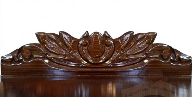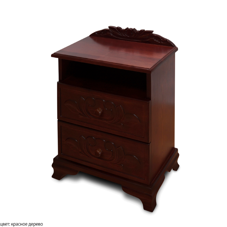 Деревянная прикроватная тумба "Реверанс". Фасады ящиков выполняются с рельефной художественной резьбой. Особенность этой тумбочки - открытая верхняя ниша и фигурная фаска по верхнему периметру, а так же рельефный резной элемент вверху, выполненный в одном стиле с фасадами ящиков. Сочетание натуральной древесины и современных эколаков - залог экологичности и безопасности мебели для дома. Возможно изготовление нестандартных размеров.